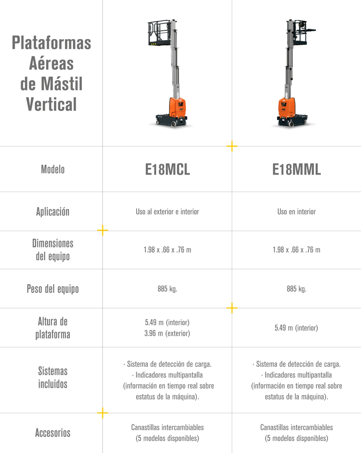 Entre sus características más notables encontramos que los modelos E18 cuentan con baterías recargables de larga duración que ofrecen dos veces más ciclos de servicio y un sistema de detección de carga que monitorea que la capacidad de peso no sea excedida. Además, las plataformas están equipadas con controles modernos que facilitan la navegación, una entrada/salida mejorada para mayor ergonomía y la novedosa implementación que permite a los operadores cambiar diferentes tipos de canastillas para adaptarse a los requisitos de trabajos específicos.