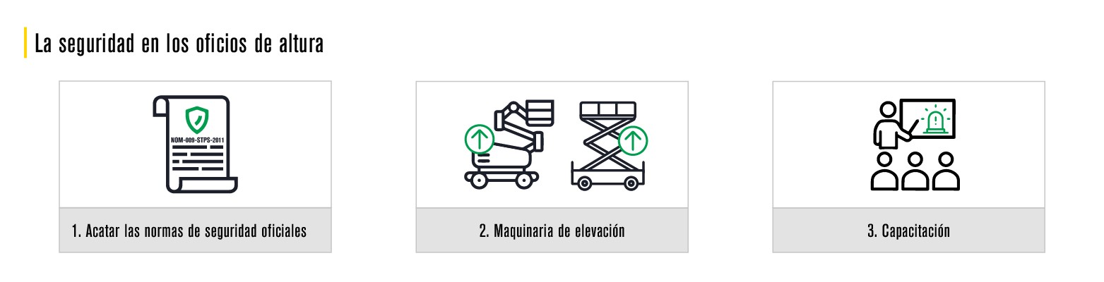 Seguir las normas de seguridad establecidas, tanto la normativa local como la del fabricante, que habla sobre las condiciones de trabajo y el uso de equipo de protección personal que, para los trabajos en altura, deben incluir una línea de vida obligatoria para evitar el riesgo de caídas. - Maquinaria de elevación